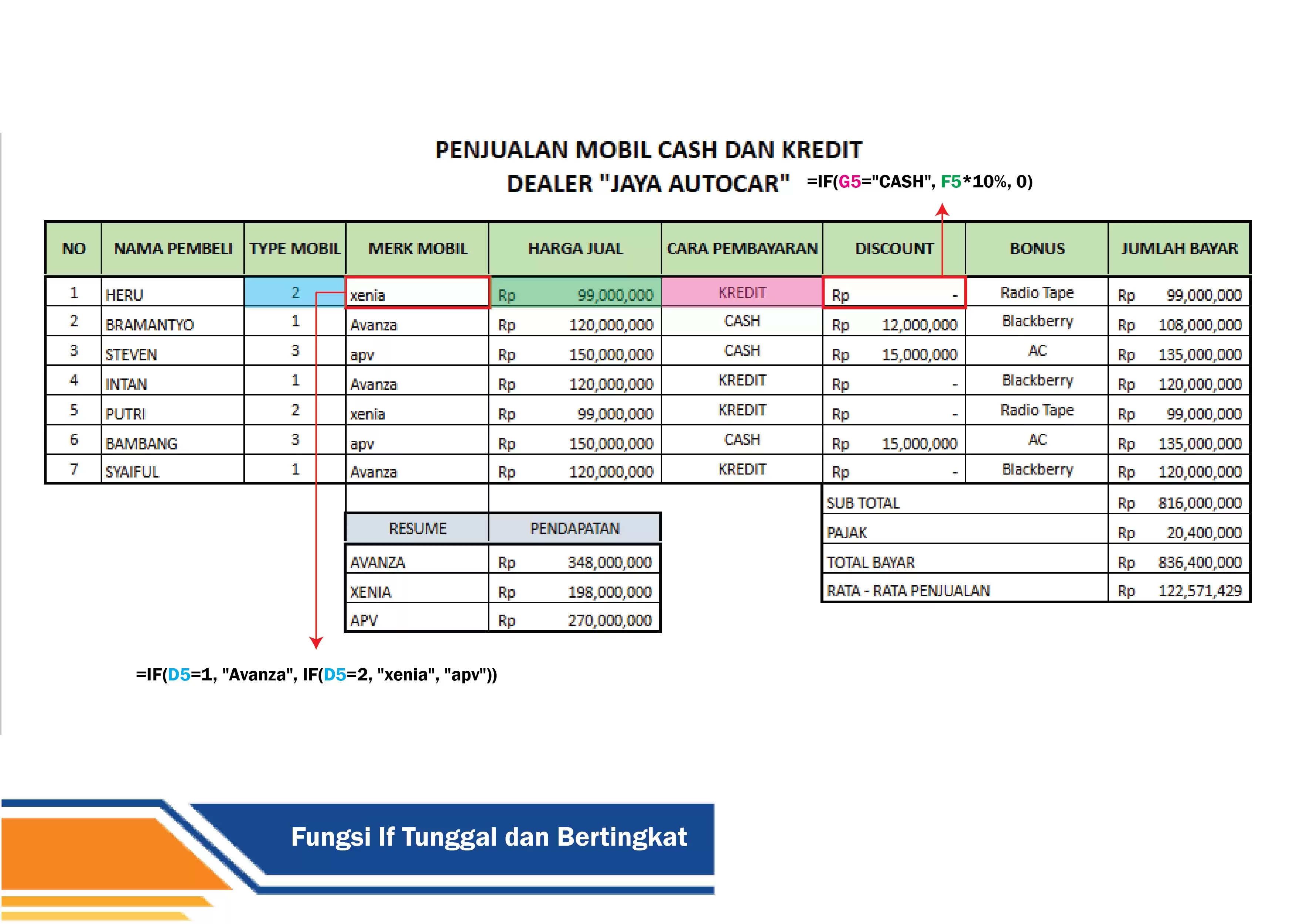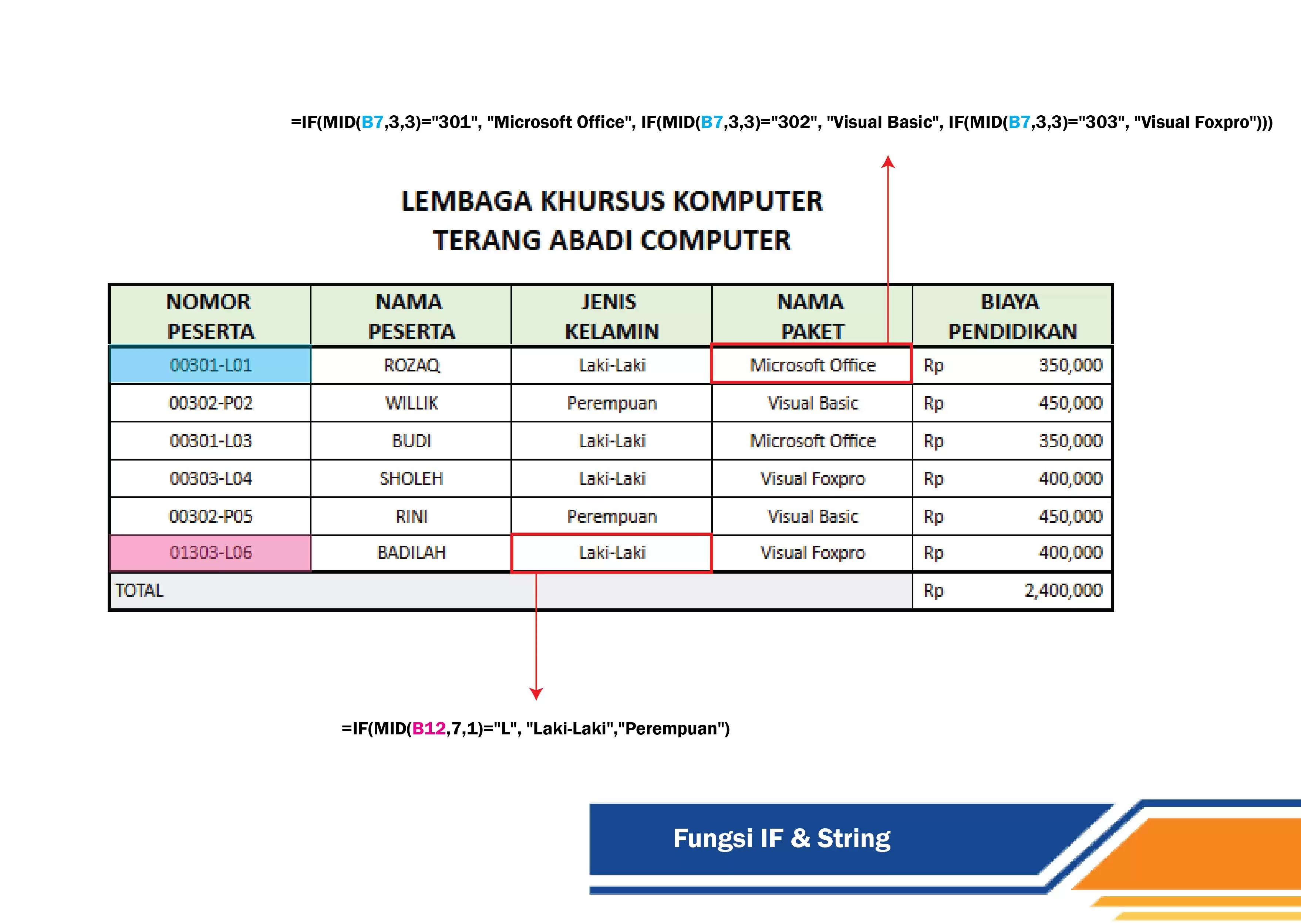 Mempelajari konsep dan penggunaan fungsi IF baik tunggal maupun bertingkat. Kemudian dikombinasikan juga dengan fungsi string seperti: Left(), Right(), Mid(), Value(), TEXT(), Find()