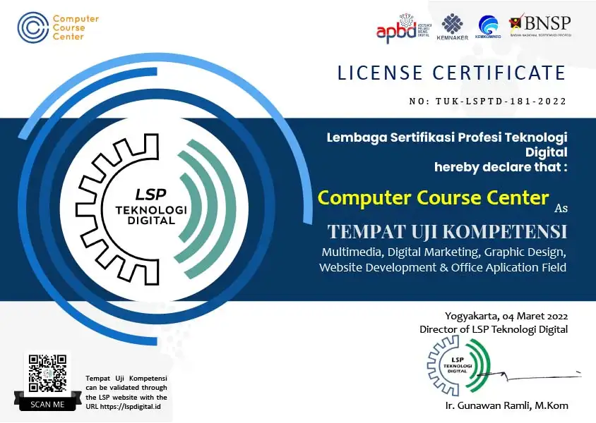 - Computer Course Center juga sudah memiliki Nomor Induk LKP (NILEK) nasional dengan nomor: 22201.1.0104.